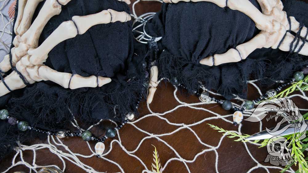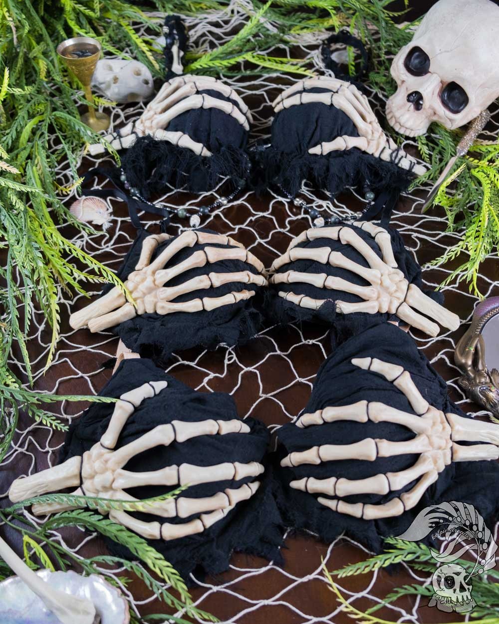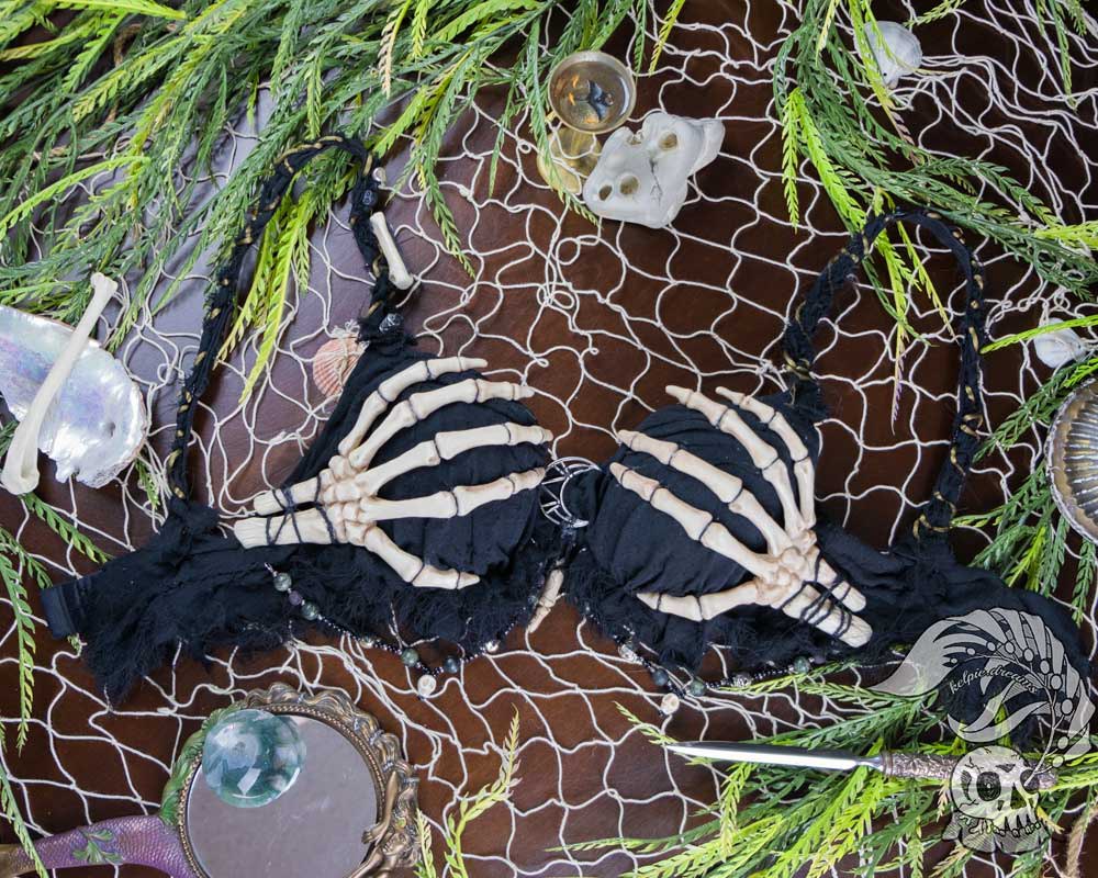 When ordering, send an email with bra size, bead and decoration colors, yes or no barnacles, and any specific charms or motifs you might like to [email protected] - for example, the prompts for the bra that the model in the photos is wearing would be "green and skull beads with silver charms." Please keep in mind that the linen will still be black with offwhite bones!