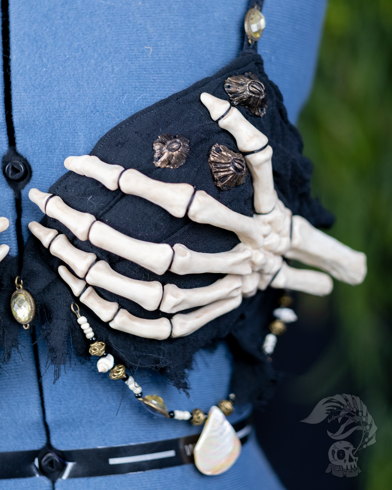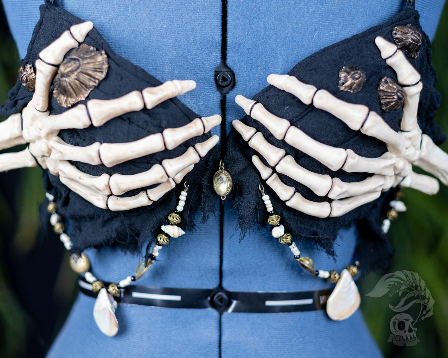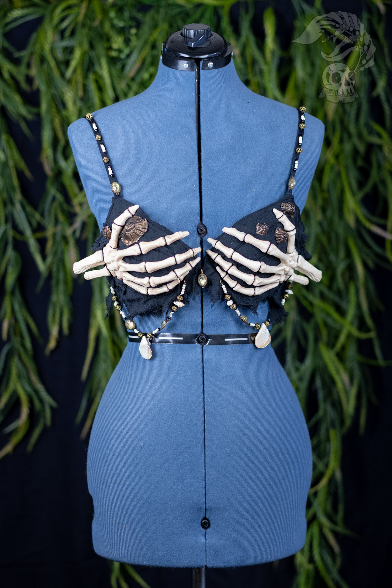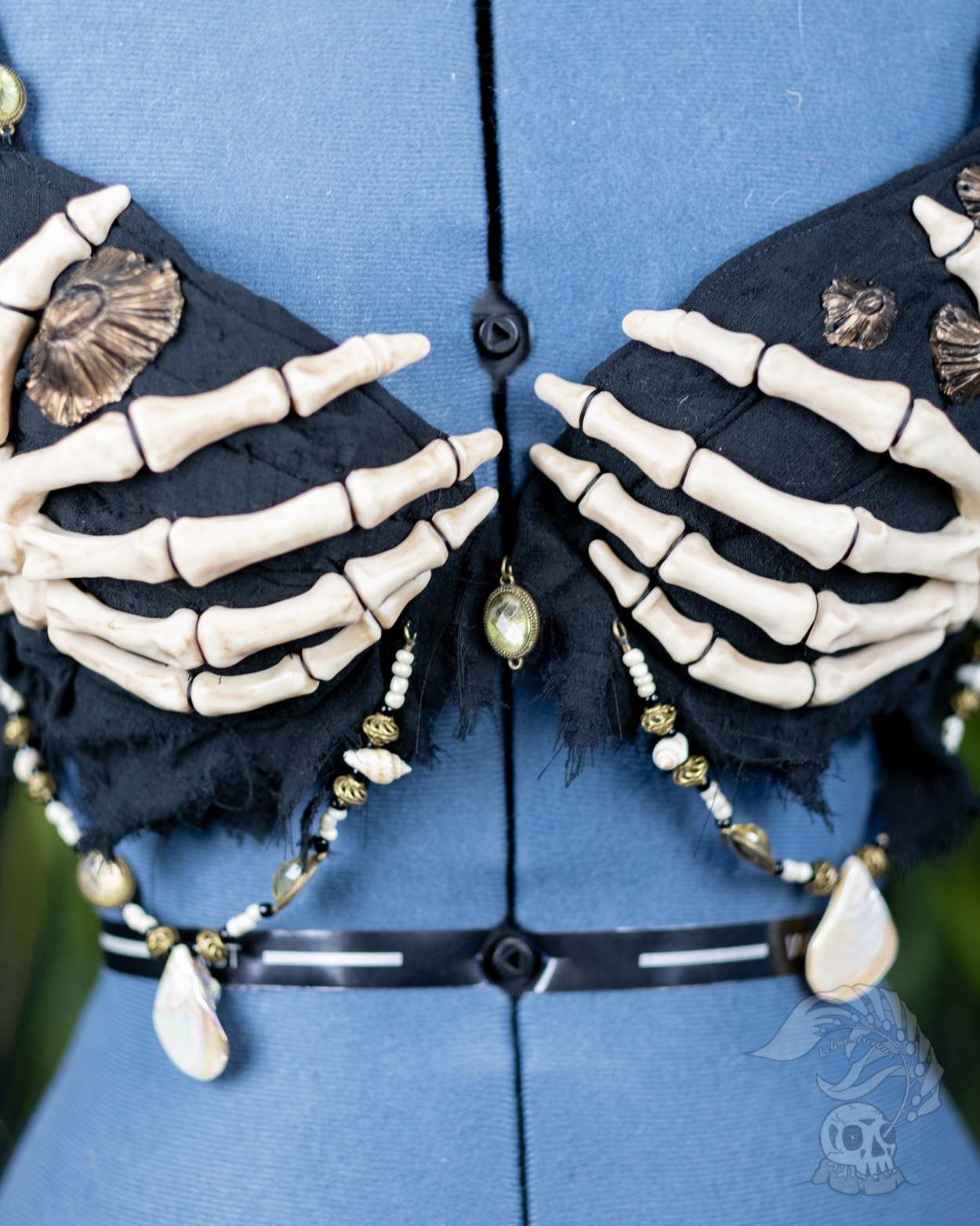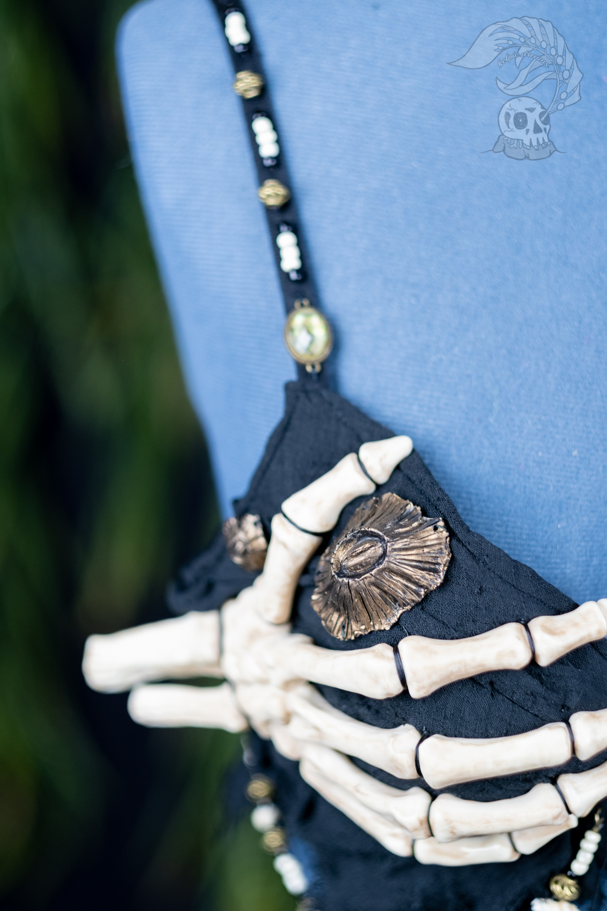 A perfect top for sirens looking to drown some sailors! Distressed black linen with soft plastic skeletal hands, hand painted resin barnacles, ivory colored and antiqued gold beads, abalone shells, and decorated straps come together for this haunting and ancient look.