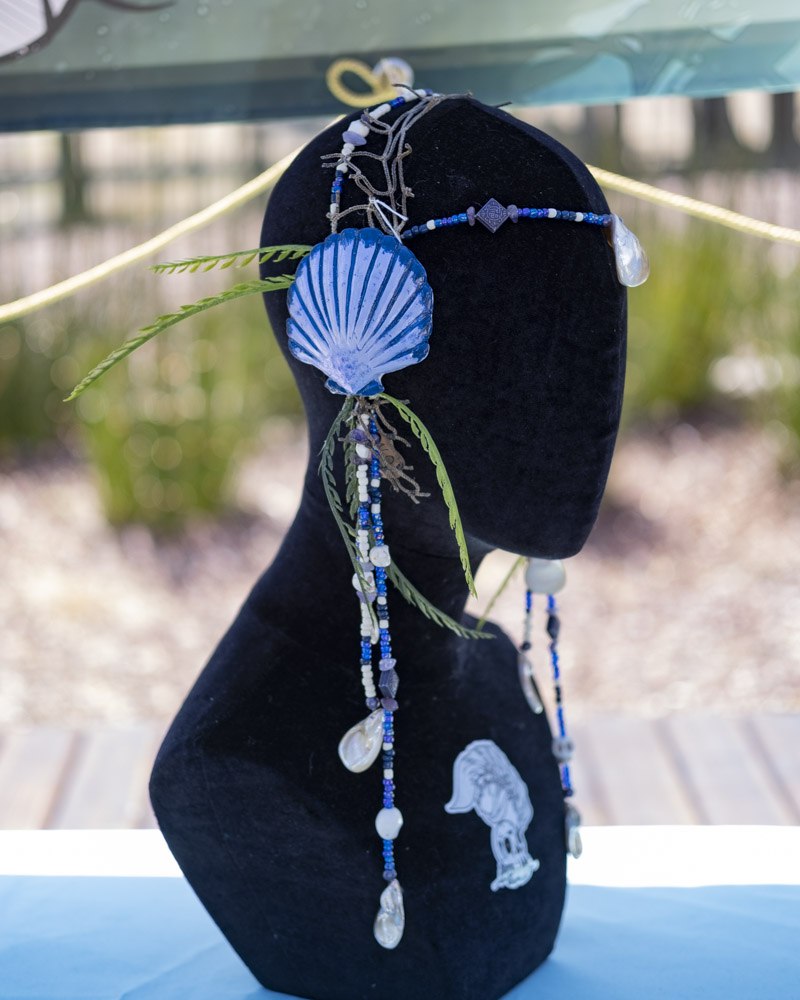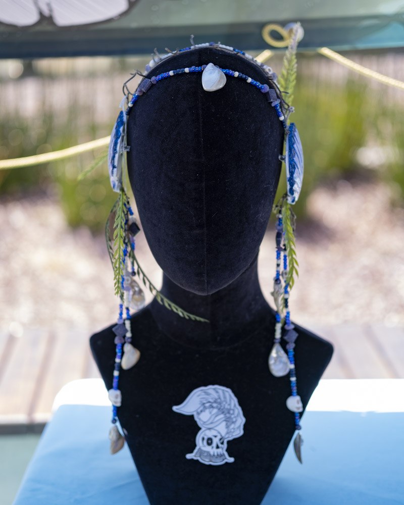 All of our headdresses are swimmable, reef safe, aquarium safe, and are sculpted, cast, painted, and beaded by hand with sustainable and water safe materials.