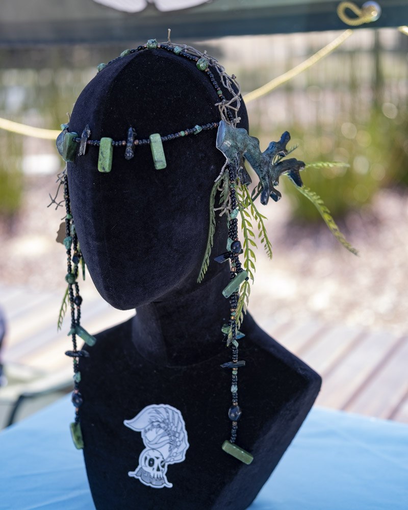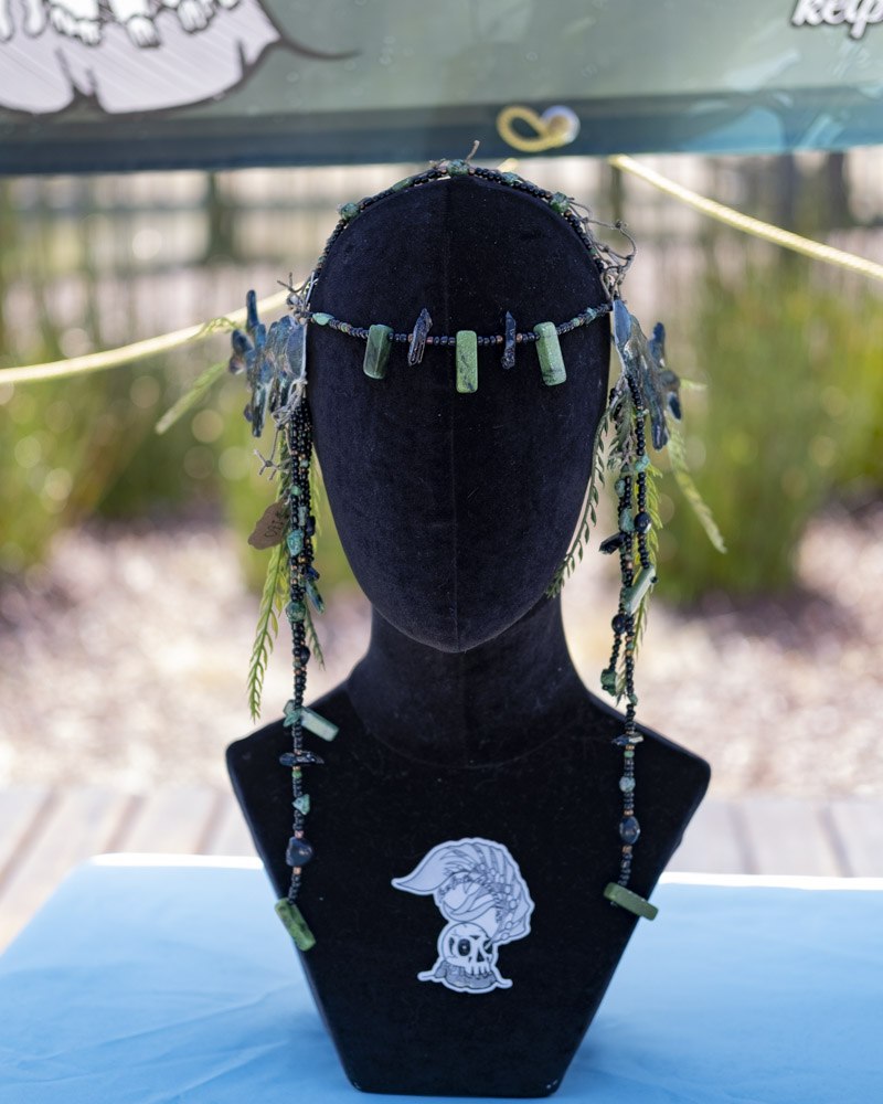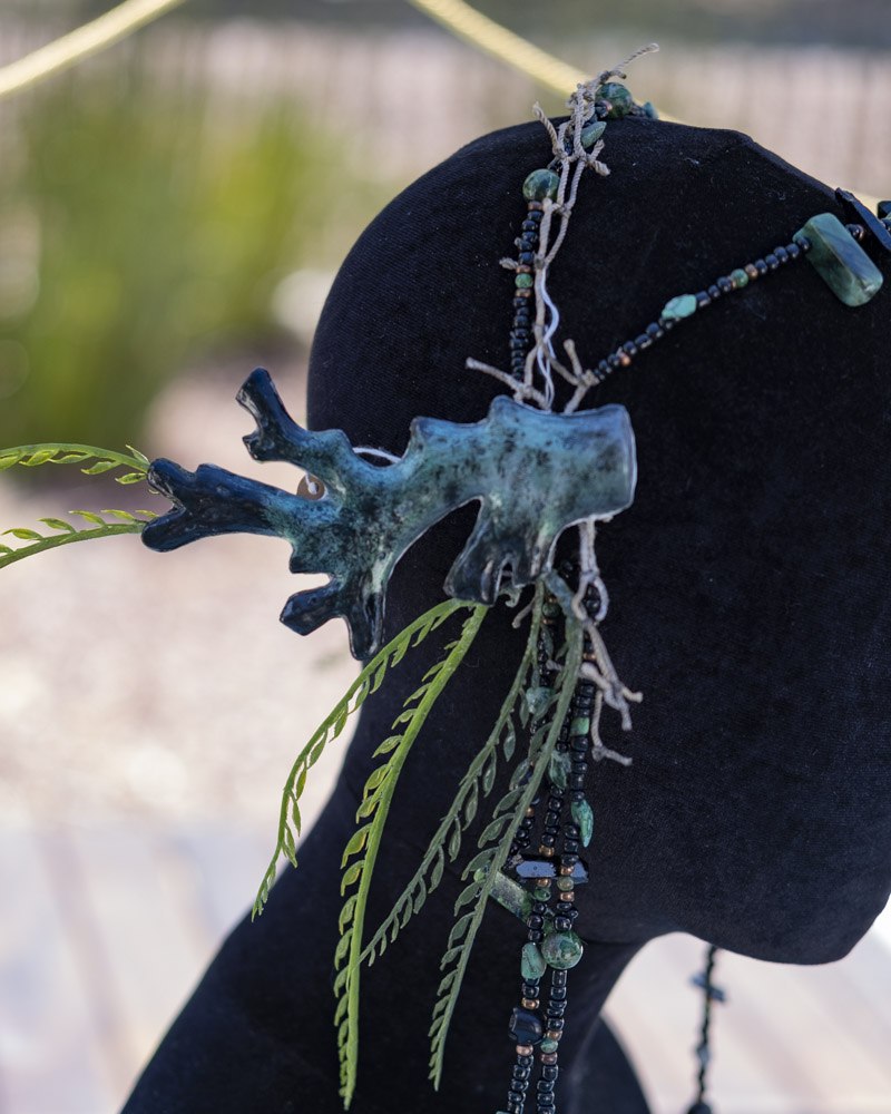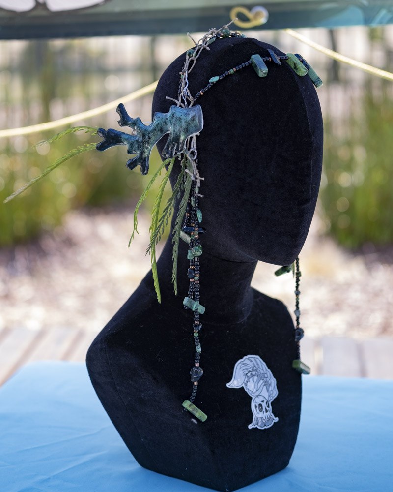 All of our headdresses are swimmable, reef safe, aquarium safe, and are sculpted, cast, painted, and beaded by hand with sustainable and water safe materials.