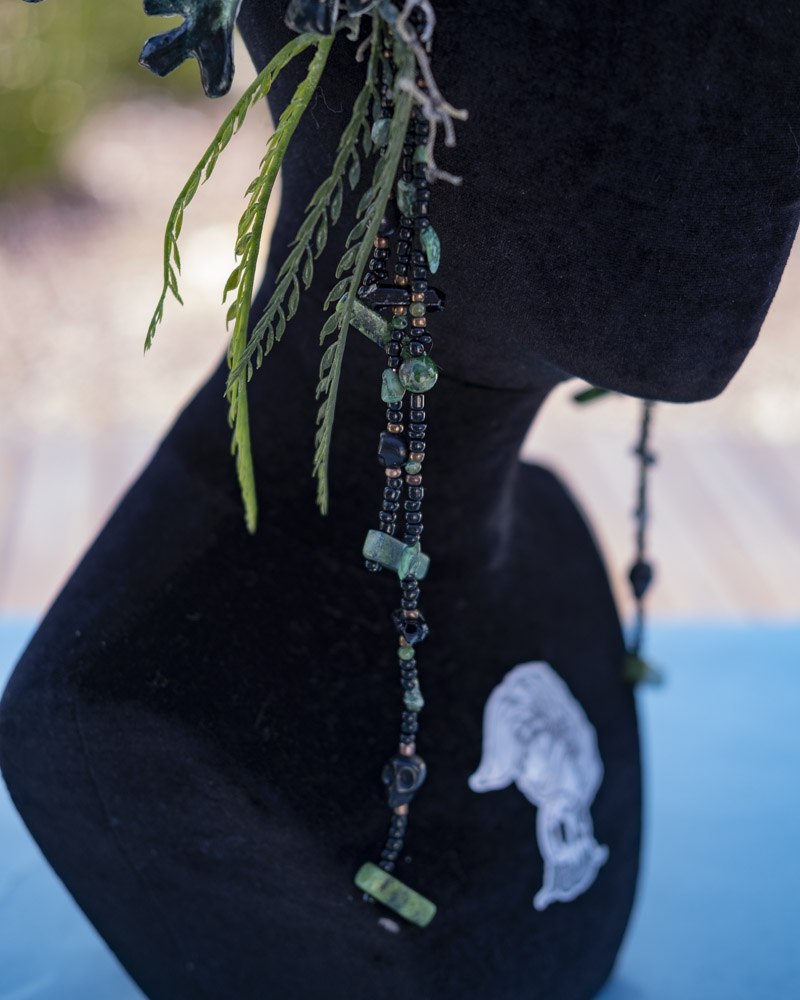 With a black to green holo coat and green and black skull beads, this one of a kind artist-designed piece is ready to ship within 3 business days.
